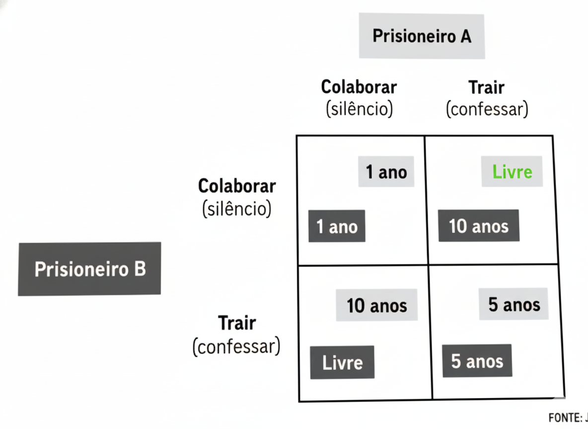 O Dilema dos Prisioneiros é um dos experimentos mais conhecidos da Teoria dos Jogos, criada para explicar por que indivíduos racionais podem não cooperar mesmo quando a cooperação seria o melhor resultado coletivo.